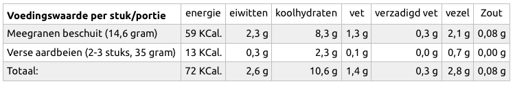 Aardbeien leveren amper calorieën, maar wel veel smaak! En vezels en vitamine C. De 2 aardbeien die ik op mijn beschuitje nam leveren ongeveer 22 gram vitamine C en 0,7 gram vezels.