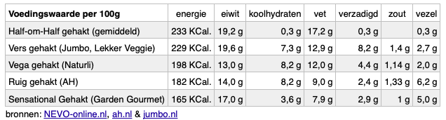 Vega rauw gehakt bevat minder vet dan half-om-half gehakt, maar wel (veel) meer verzadigde vetten. Bovendien is er vaak behoorlijk veel zout toegevoegd.