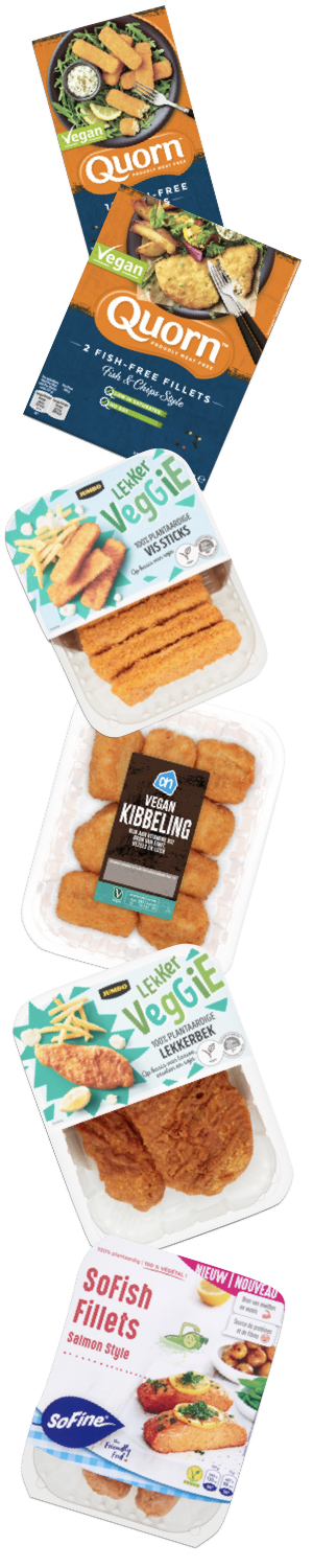 De Quorn visvervangers zijn gemaakt op basis van Mycoprotein, een soort schimmel. De Kibbelig van AH is op basis van rijst, de lekker bekjes van Jumbo zijn gemaakt van tarwe- en erwteneiwit en de overige varianten zijn op basis van soja. AH en Jumbo voegen daarnaast nog vitamine B12 en ijzer toe aan hun producten.