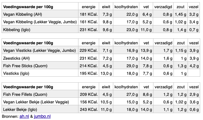 Wat als eerste opvalt, is dat vegan lekker bekjes en kibbeling een stuk minder vet zijn dan ‘echt’ en dat het bij visstick precies omgekeerd is. Vegan kibbeling bevat ongeveer evenveel eiwitten als kibbeling gemaakt van vis, terwijl visvrijer vissticks veel minder eiwitten bevatten. De Quorn producten zijn hierop de uitzondering, die bevatten veel minder eiwitten dan de andere vis(vrije)sticks en lekkerbekjes.