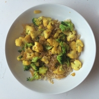 Zet een pan water op het vuur en breng aan de kook. Snipper de ui en fruit deze in een wok of ruime koekenpan aan in wat (kokos)olie. De de kruiden erbij en bak deze kort mee, afblussen met een scheutje ketjap. Doe nu de groenten erbij en roer goed om. Als het goed is kookt het water inmiddels. Kook de noodles hierin in 2 minuten gaar (volg de aanwijzingen op de verpakking). Blijf de groenten af en toe omroeren en voeg eventueel een klein beetje water toe. Giet de noodles af en doe deze bij de groenten, meng alles goed door en dien op met de sesamzaadjes.